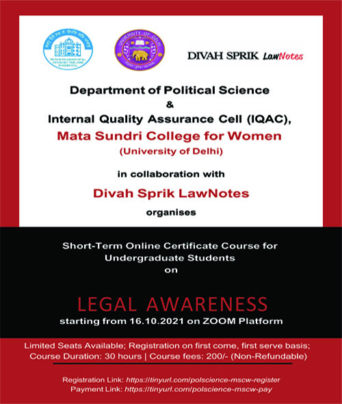 The Department of Political Science and IQAC, Mata Sundri College for Women, Delhi University in collaboration with Divah Sprik Law Notes from 16th October- 13th November course encompassed 15 sessions conducted by legal experts and luminaries. This course was specifically designed for undergraduates’ students who are not involved in the course of law.