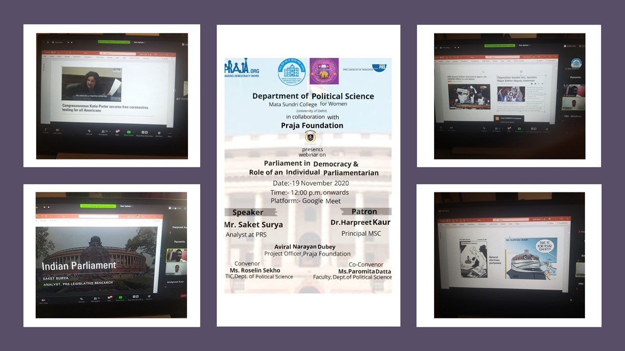 The Dept. of Political Science in association with Praja Foundation and PRS- Legislative Research organized a webinar on Parliament in Democracy & Role of an individual Parliamentarian on 19th Nov. 2020. The objective of this webinar was to highlight the role of Parliament in a democracy.