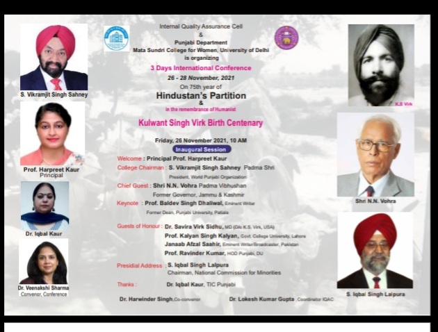 Punjabi Department, Mata Sundri College for Women, Delhi University under the guidance of Principal Dr. Harpreet Kaur and College Chairman Padmashri Vikramjit Singh Sahney organized a 3 Day International Conference on 75 years of tragic partition of Hindustan and celebrating humanist Kulwant Singh Virk on his Birth Centenary.