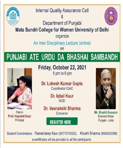 Punjabi Department of Mata Sundri College for Women and IQAC organized an Inter Disciplinary Lecture on the Genealogical relationship between Punjabi and Urdu on the title of “Punjabi Ate Urdu Da Bhashai Sambandh” on 22nd October, 2021.