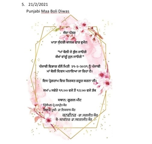 With the purpose of promoting the Punjabi language, the Punjabi department organized the Mother Tongue Day “Punjabi Maa Boli Diwas” on 21st February 2021.