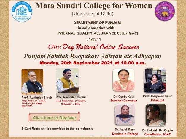 The Department of Punjabi, Mata Sundri College for Women Delhi University in association with the Internal Quality Assurance Cell conducted a one day National Seminar on ‘Punjabi Sahitak Roopakar : Adhyan ate Adhyapan’ on 20th September, 2021.