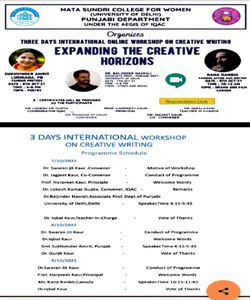 Department of Punjabi, Mata Sundri College for women, University of Delhi New Delhi has collaborated with IQAC and presented a workshop on creative writing from 7th October to 9th October 2021. Three topics were covered in the workshop that are - Story & Novel writing, Poem writing and film & Play writing.