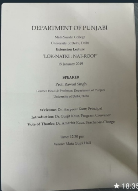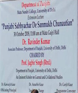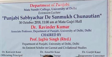 The Department of Punjabi, Mata Sundri College, University of Delhi, Organized an Extension Lecture on the Topic “Punjabi Sabhyachar de Sanmukh Chunautian’ on 30 October, 2018 by Dr. Ravinder Kumar (Ravi Ravinder), Associate Professor, Department of Punjabi, University of Delhi.