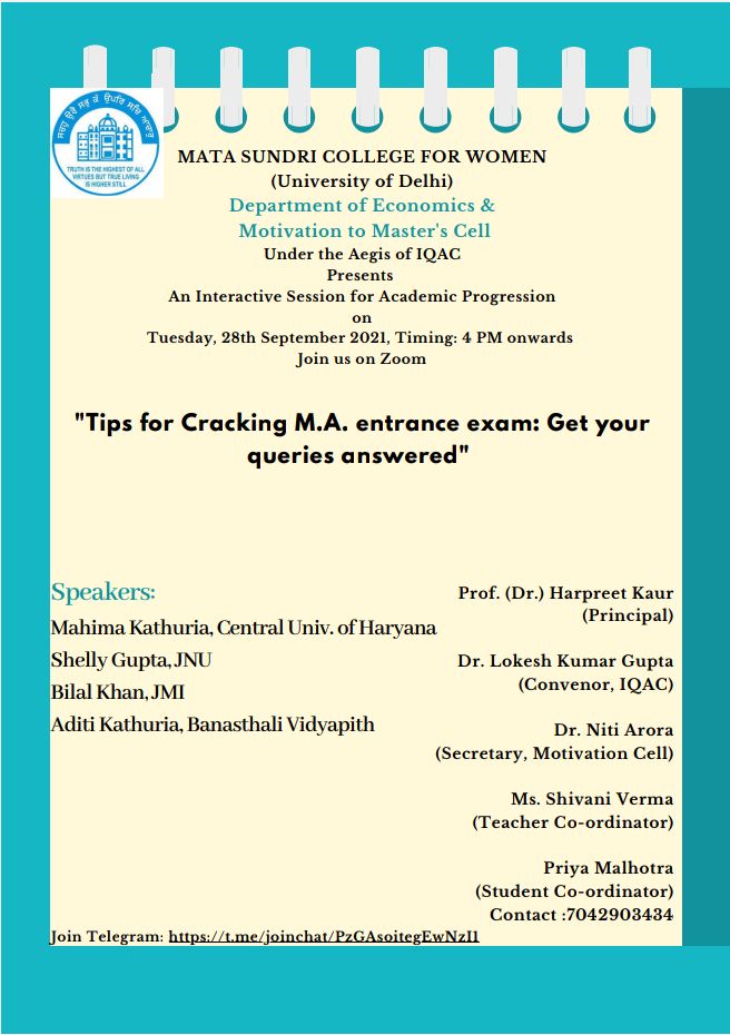 An interactive talk session was organized by Department of Economics, Mata Sundri College for Women, University of Delhi in association with Motivational to Master’s cell and Internal Quality Assurance Cell (IQAC) on 28 September 2021. The purpose of the session was to enlighten the students regarding the various options available for pursuing master’s in economics. It made them learn about the universities offering master’s and the structure of their entrance procedure.