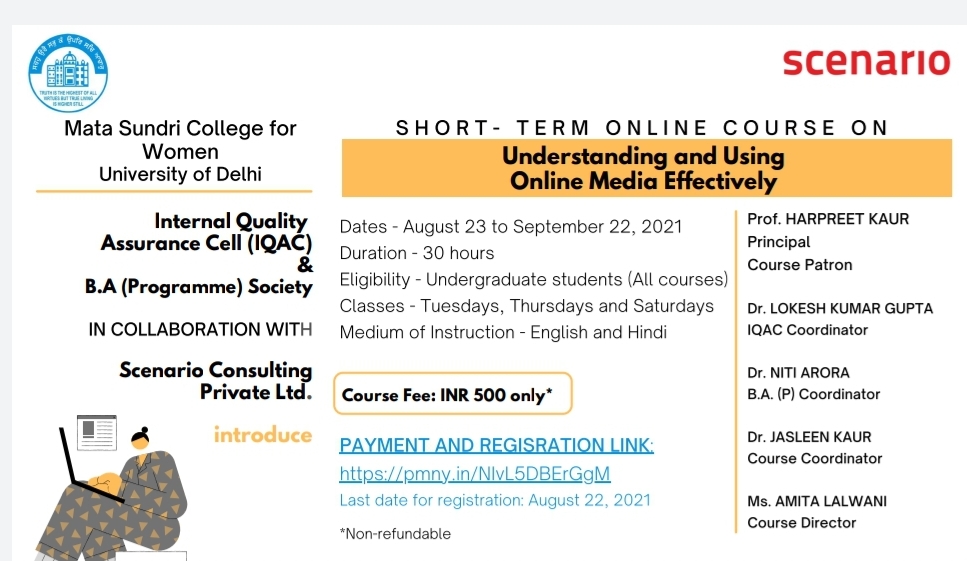 A Short - term Online Course on understanding & using online media effectively was held by the department of Economics, B.A. (Programme) Society and IQAC in collaboration with Scenario Consulting Pvt. Ltd for duration of 30 hours from 23rd august to 22nd september,2021. This course is aimed for all young students who want to learn more about how media influences their mind and their choices. This course will help students understand how they can become more critical consumers, curators and creators of media. It will also offer a brief introduction to careers in media for students looking at professional opportunities in media and communication